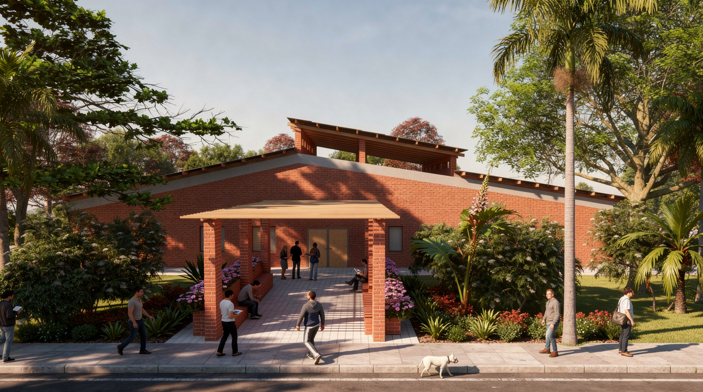Design of a community cultural focused on providing spaces for social interaction, digital access, and community activities across different age groups. The project explores spatial organization and material strategies using locally available resources such as brick and bamboo, minimizing the use of concrete.