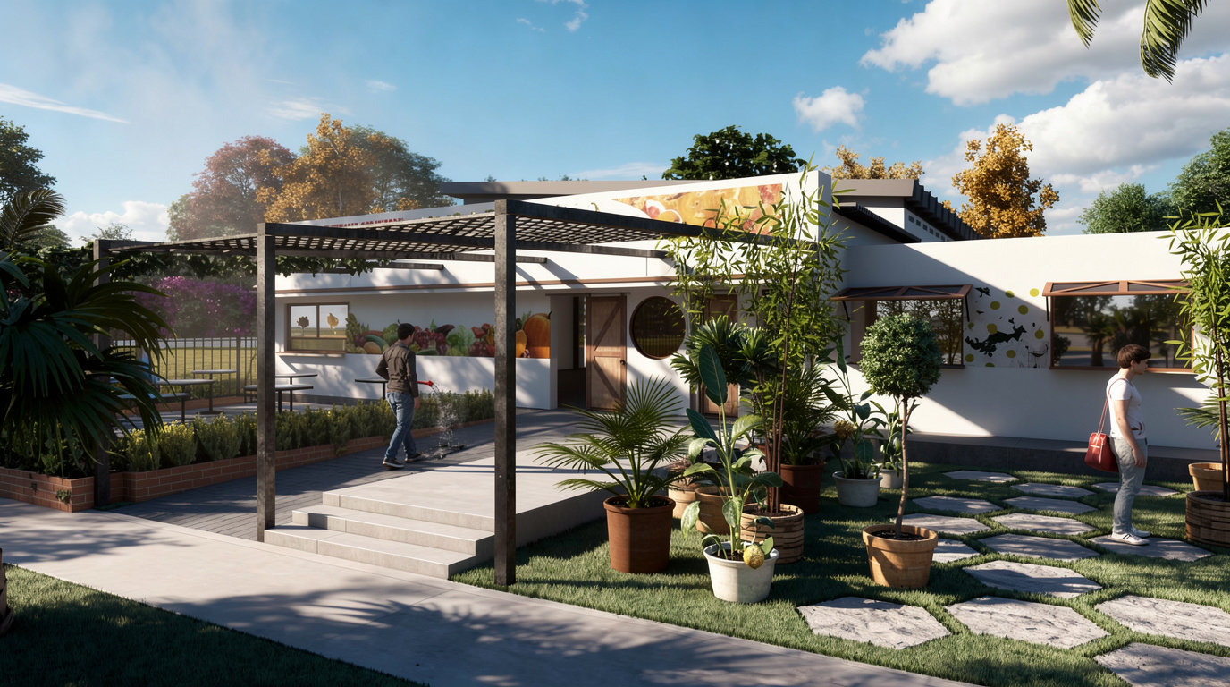 Design proposal for a local restaurant transforming an underutilized outdoor and service area into a functional commercial space. The project includes spatial reorganization, indoor–outdoor integration, and the development of architectural and visual elements to support the client’s needs.