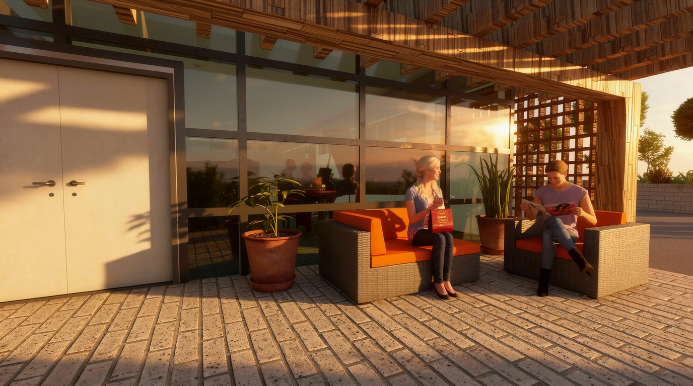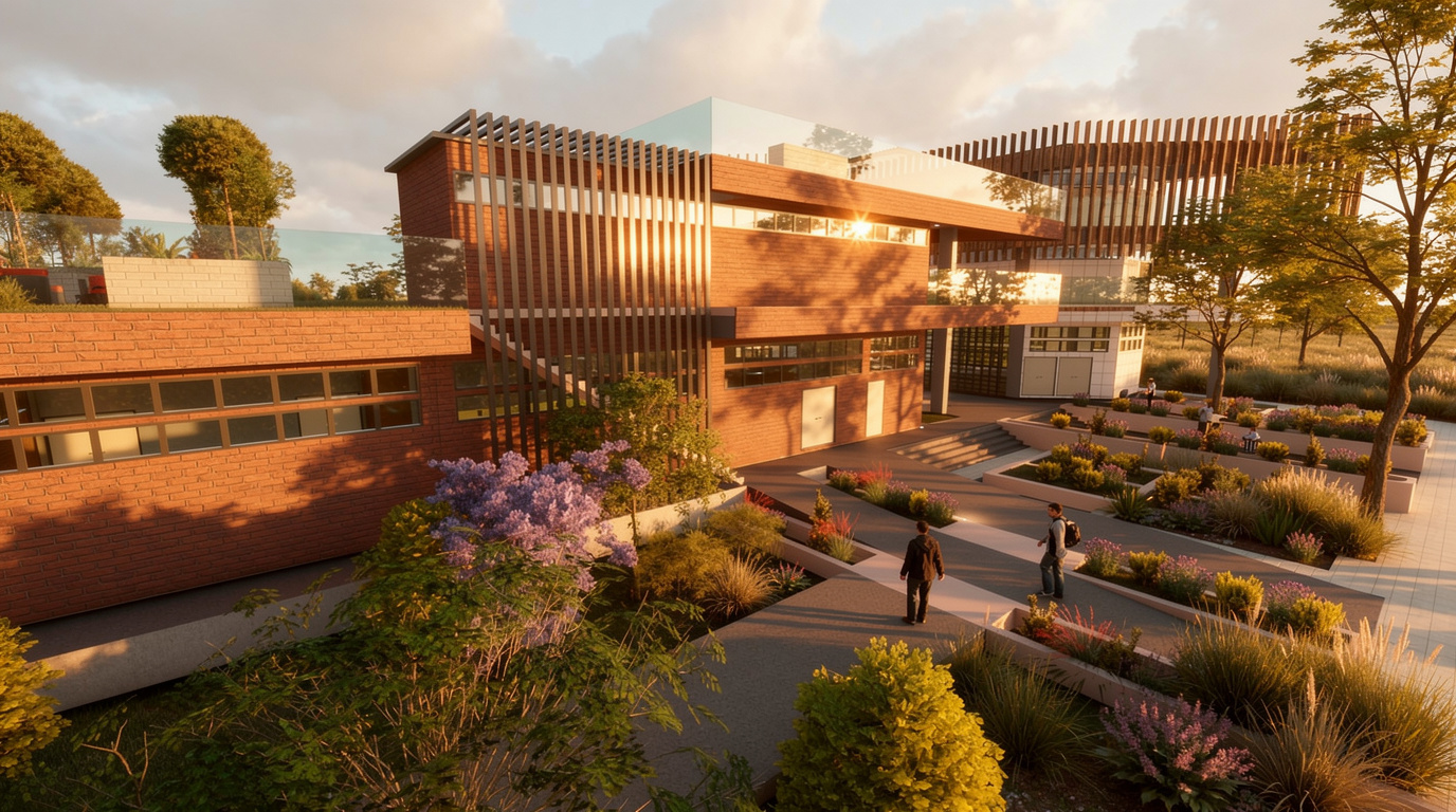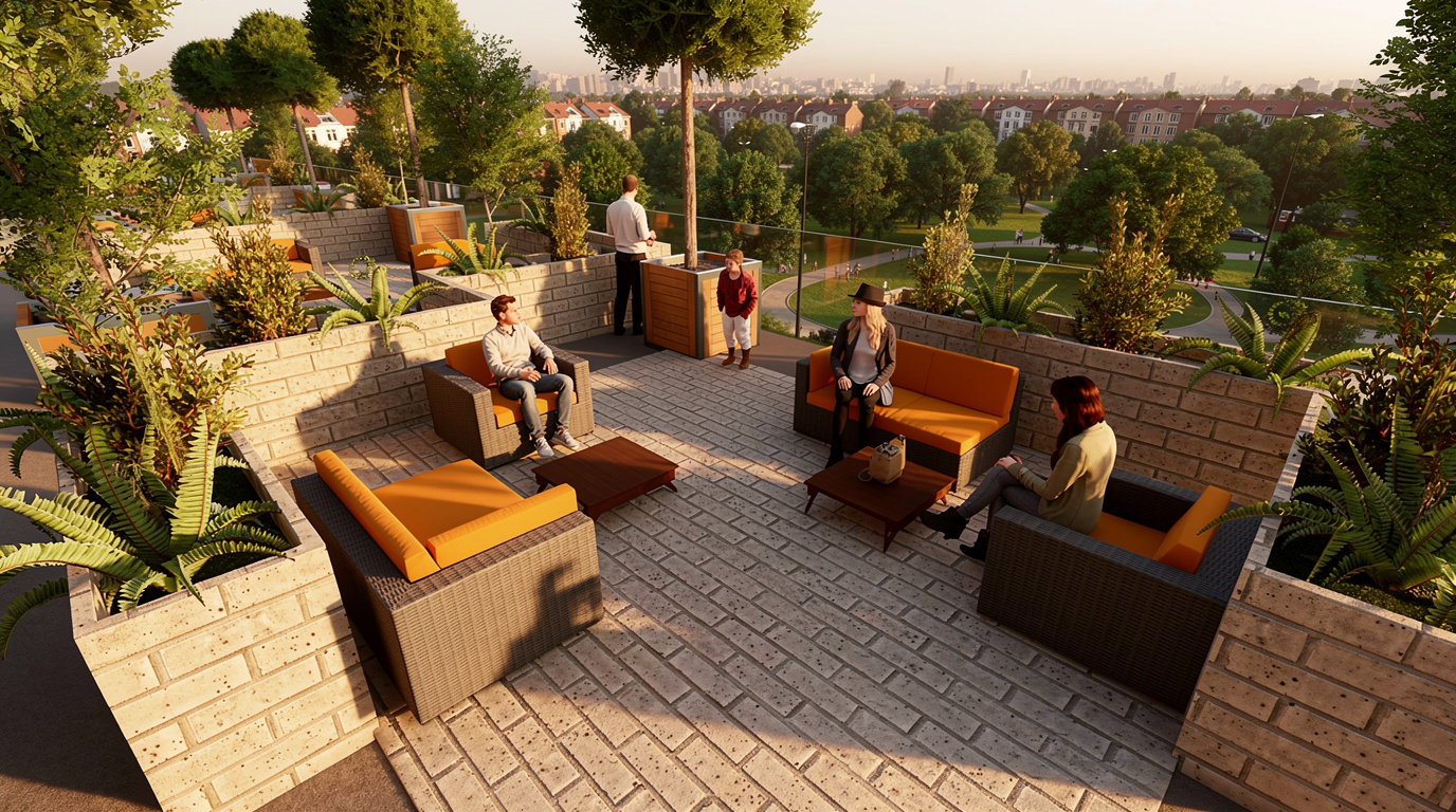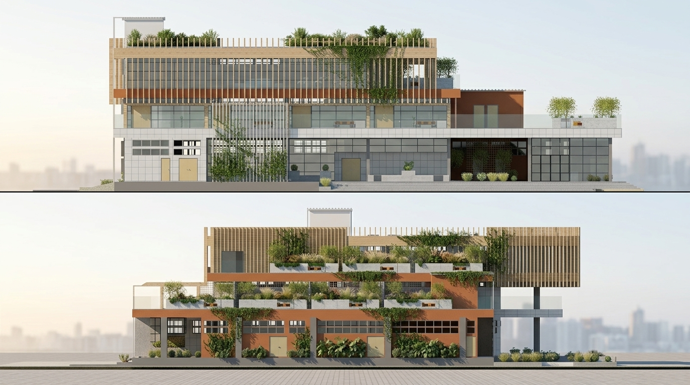 The proposal incorporates sustainable design principles through the use of rooftop vegetation and renewable energy systems such as solar panels. These strategies contribute to environmental performance while enhancing the building’s integration with its surroundings.