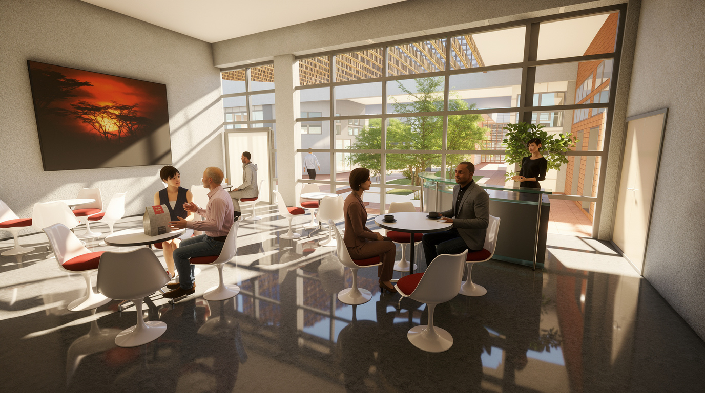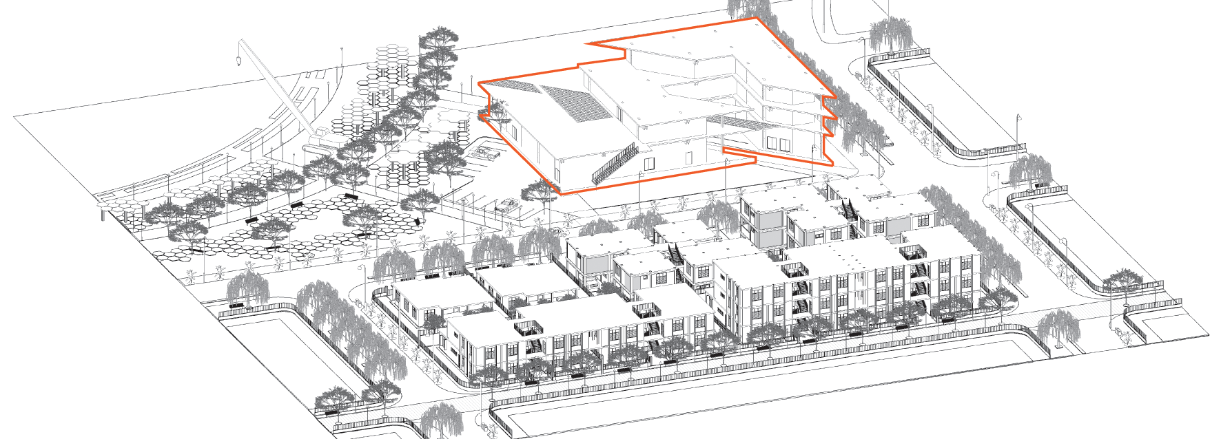The architectural concept is based on the composition of intersecting volumes using diverse materials, representing the coexistence and unity of different cultures and ideas. The design integrates a public ground-level passage connecting the surrounding residential area with adjacent public spaces, reinforcing urban permeability and accessibility.