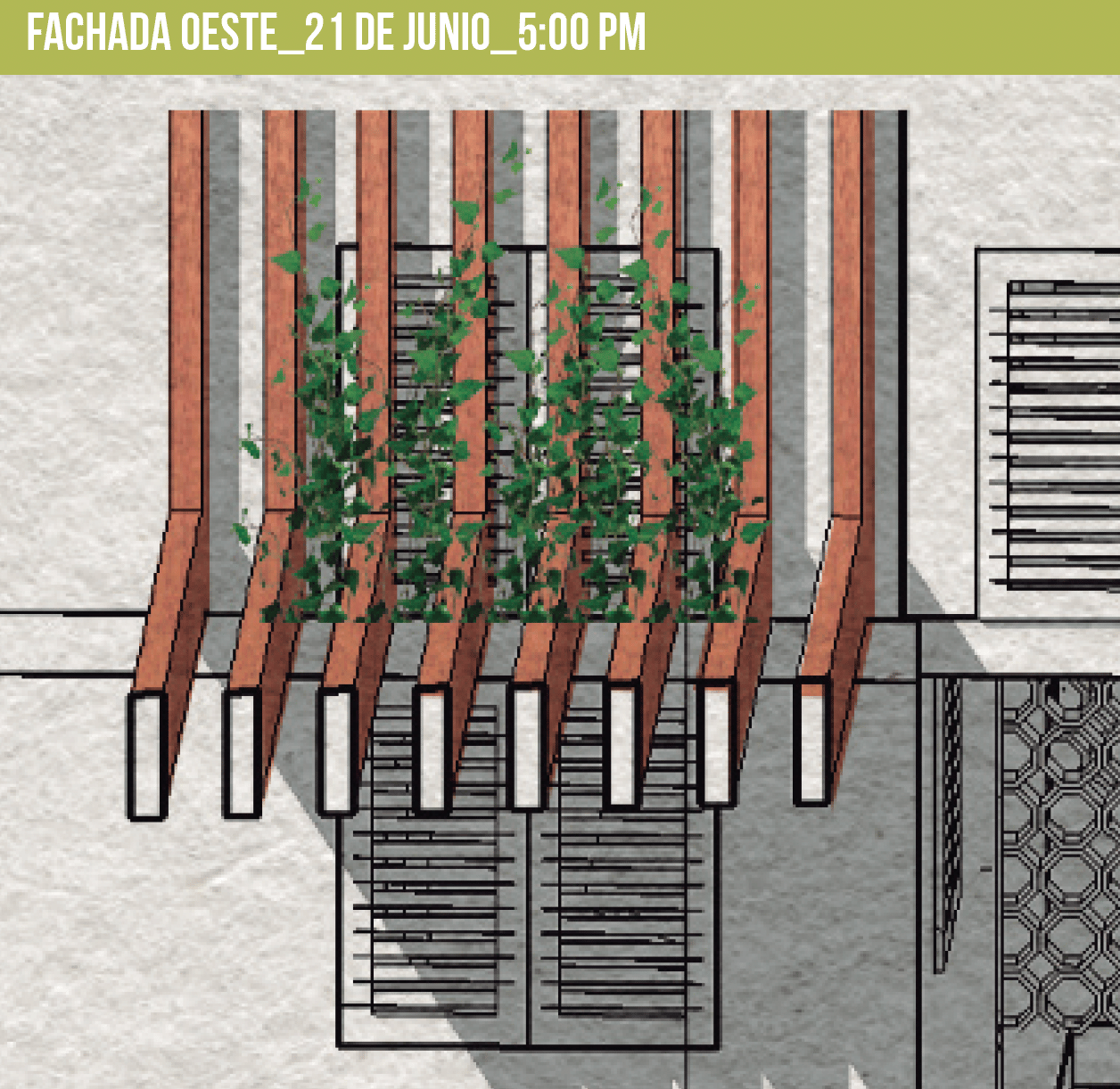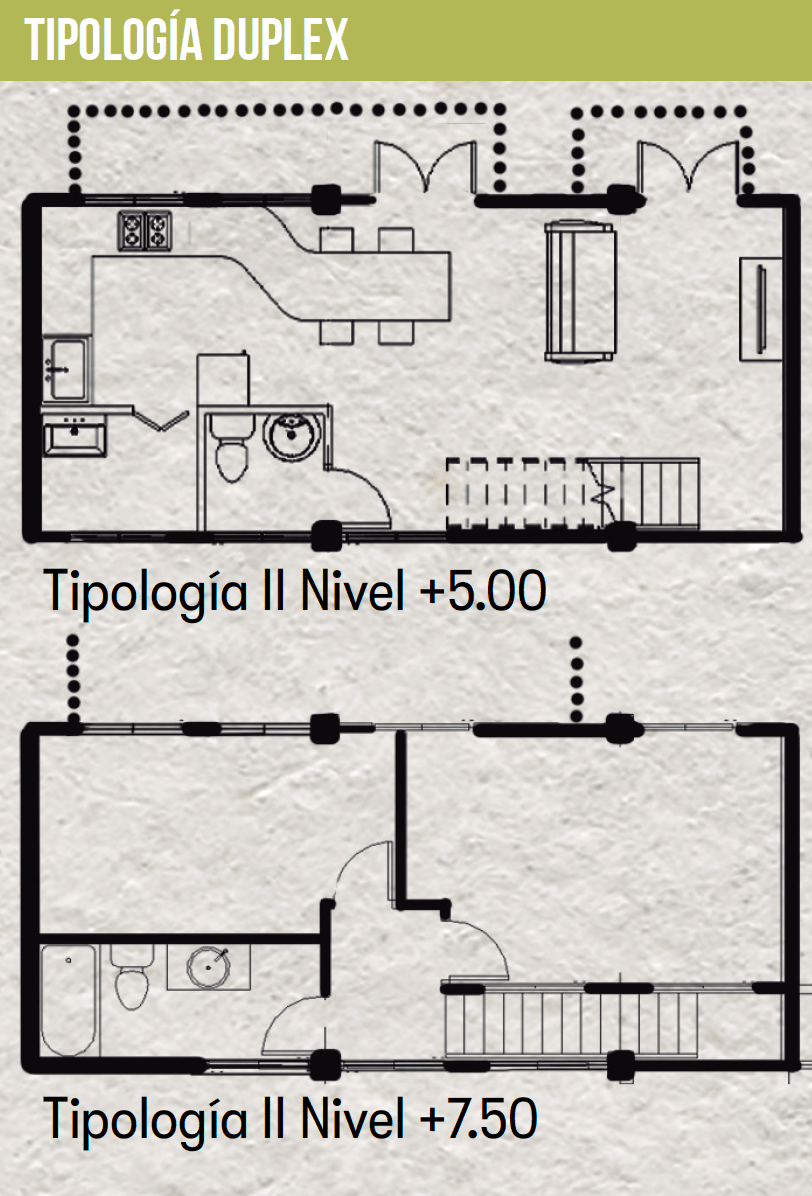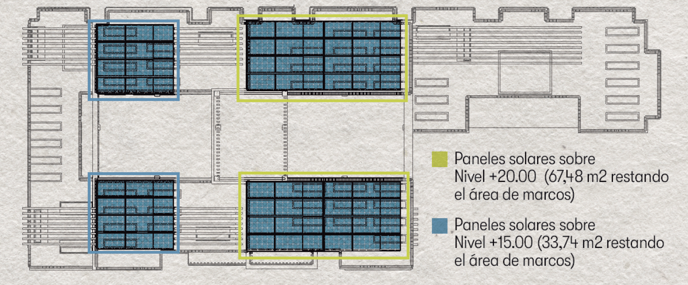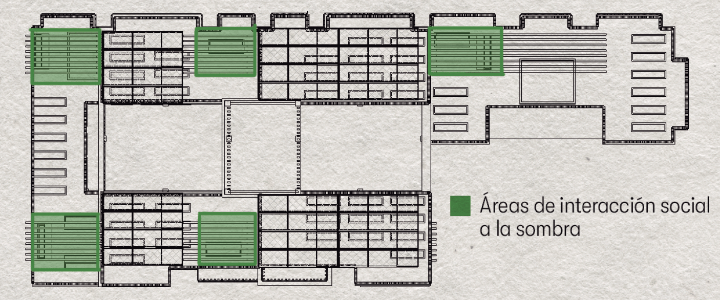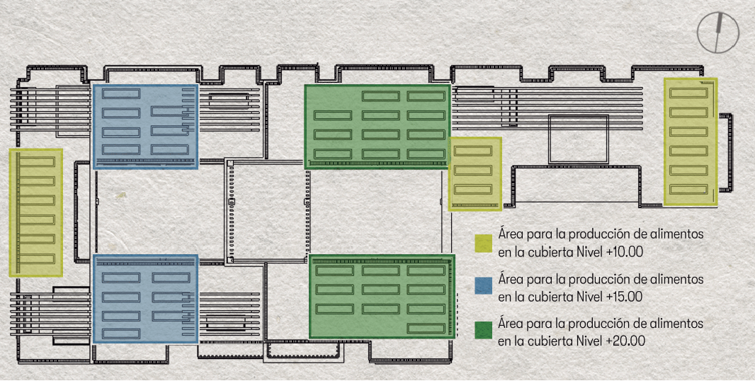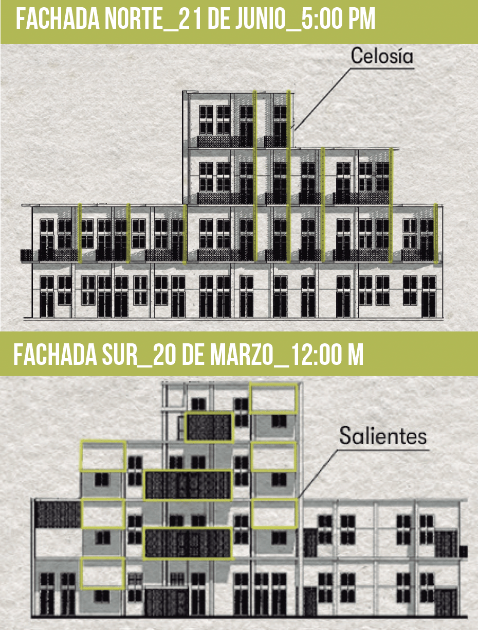 The project incorporates passive design strategies such as solar protection systems, optimized natural ventilation, and the integration of patios to enhance climatic performance. Rooftop areas are utilized for energy generation, urban agriculture, and social interaction, contributing to increased self-sufficiency.