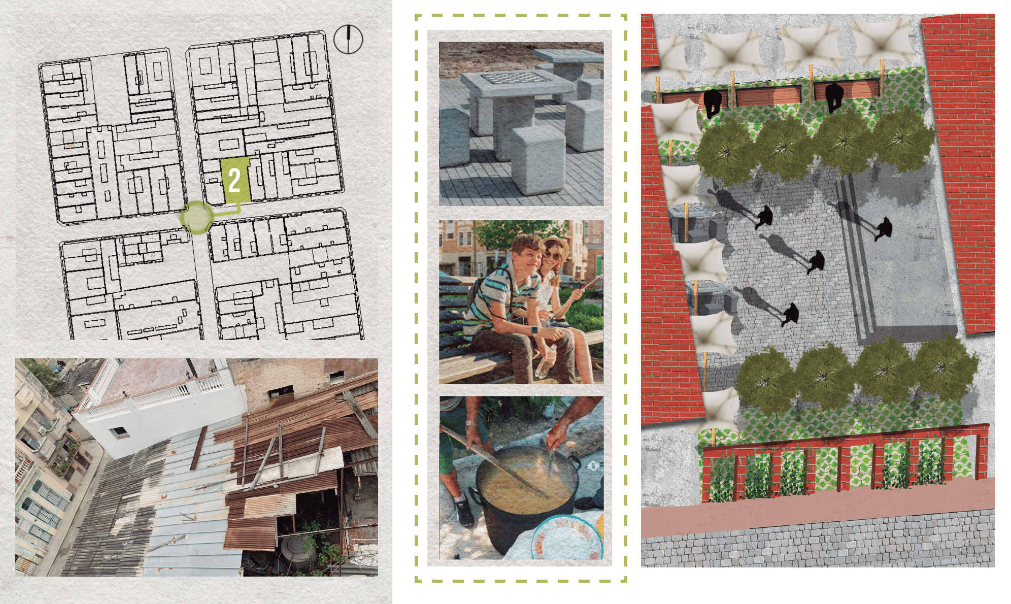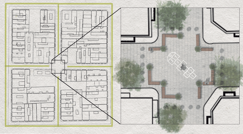 At the urban level, the project proposes spatial reorganization and interventions aimed at improving environmental performance, accessibility, and community functionality within a compact historic environment.