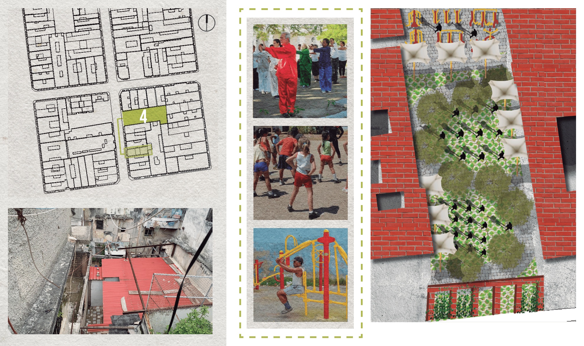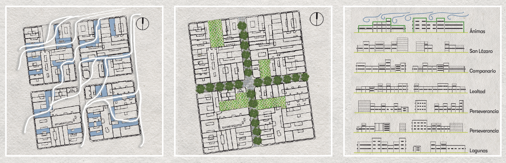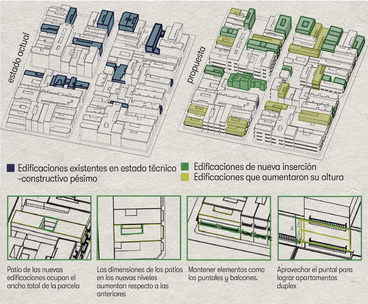 The proposal operates at two scales: an urban strategy for the revitalization of a four-block area, and the design of a new residential building within a deteriorated site. This dual approach allows the integration of broader urban interventions with specific architectural solutions.