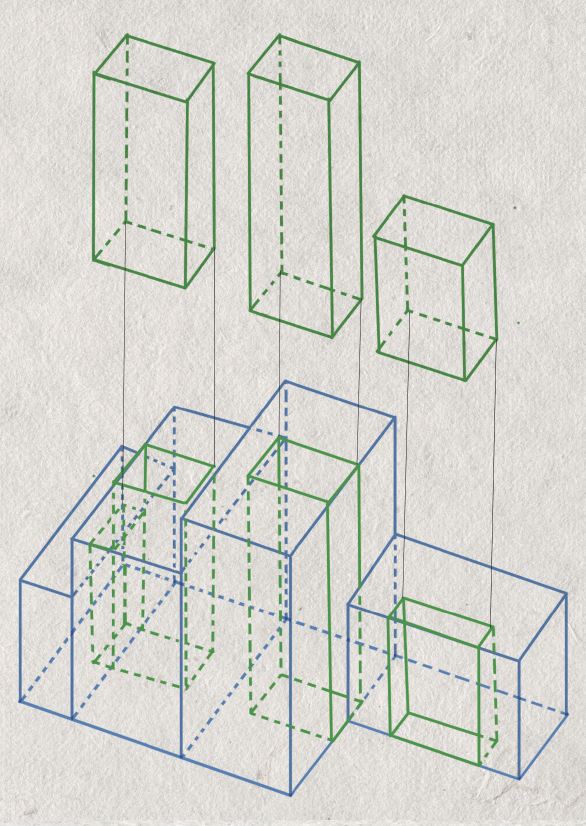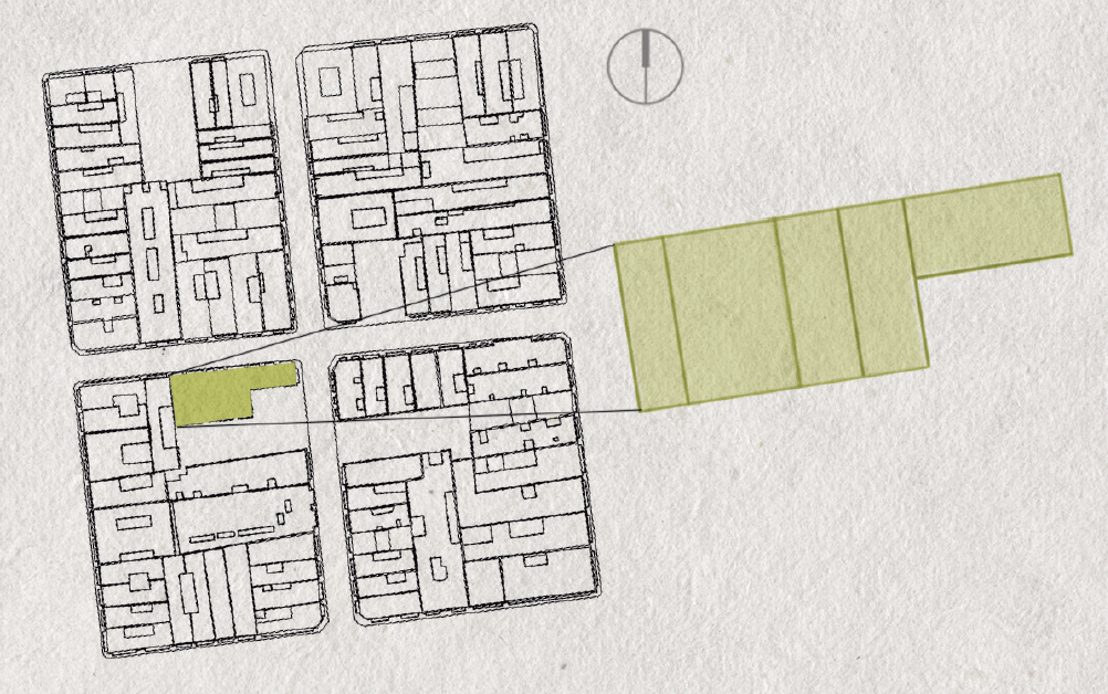 At the building scale, the design explores adaptive infill strategies, optimizing limited space through vertical organization, duplex units, and efficient layouts while maintaining continuity with the surrounding context.