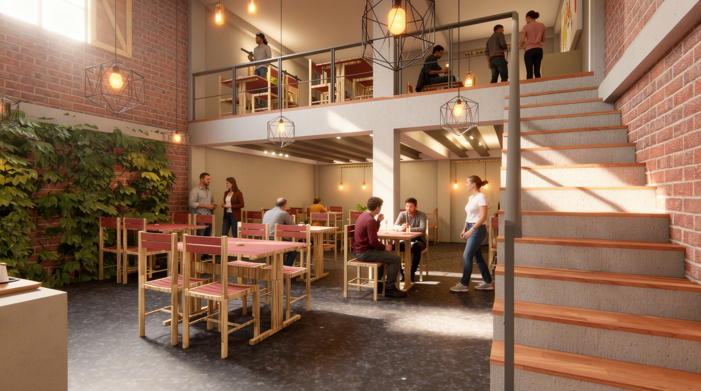 Design proposal for a local restaurant transforming an underutilized outdoor and service area into a functional commercial space. The project includes spatial reorganization, indoor–outdoor integration, and the development of architectural and visual elements to support the client’s needs.